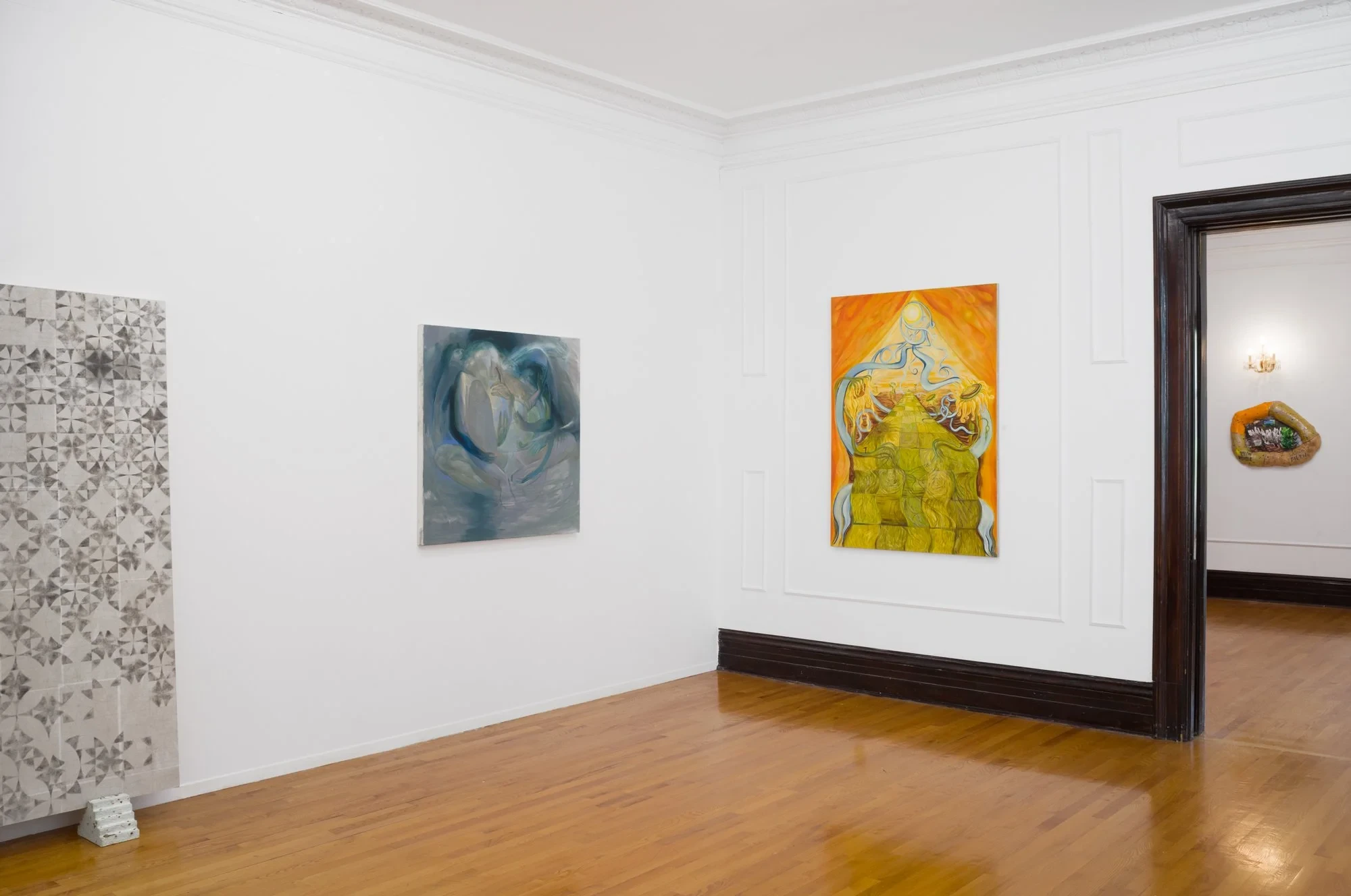 Exhibition view of a group exhibition curated by Delphine Hennelly & Grace Kalyta at Pangée, Montréal, CA, 2023, including works by Alicia Adamerovich, Trevor Baird, Catherine Desroches, Ben Gould, Oreka James, Élise Lafontaine, Alexa Hawksworth, Nadya Isabella, Manal Kara, Marlon Kroll, Darby Milbrath, Rose Nestler, Jacopo Pagin, Elisabeth Perrault, Anjuli Rathod, Oda Sønderland & Jessica Williams