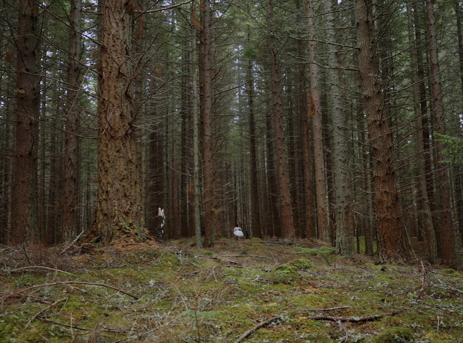 Central to this moving image work is a meditation on the proto-slavic term: воля (volya), a lexical lacuna that describes the will and desire to exist beyond societal constructs; to be wildly emancipated. A slippery term, volya is described by Russian mystic writer Nadezhda Teffi (1872-1952) in her recently translated text Other Worlds: Peasants, Pilgrims, Spirits, Saints. Teffi chronicles Liberté as a person who finishes work early, takes their hat off and is free to read the newspaper; to sit and think in the café. They are free because they have abided by the rules of society. In contrast, Teffi describes Volya as a person who takes their hat off and runs into the field, blinded by the sun as they enter into an unbroken horizon. In On Volya’s opening scene, a figure appears to float through a forest; a guise that requires being high on the toes, with knees bent and stuck together; the hips and torso unnaturally controlled. It is anything but freeing. In the following shot, the figure escapes this muscle memory in a literal attempt to volya as she runs into the remains of the ancient Caledonian Forest. The film begins in an acknowledgement that volya itself, to flee into an unbroken horizon, the densest of forests, leaves one in solitude.