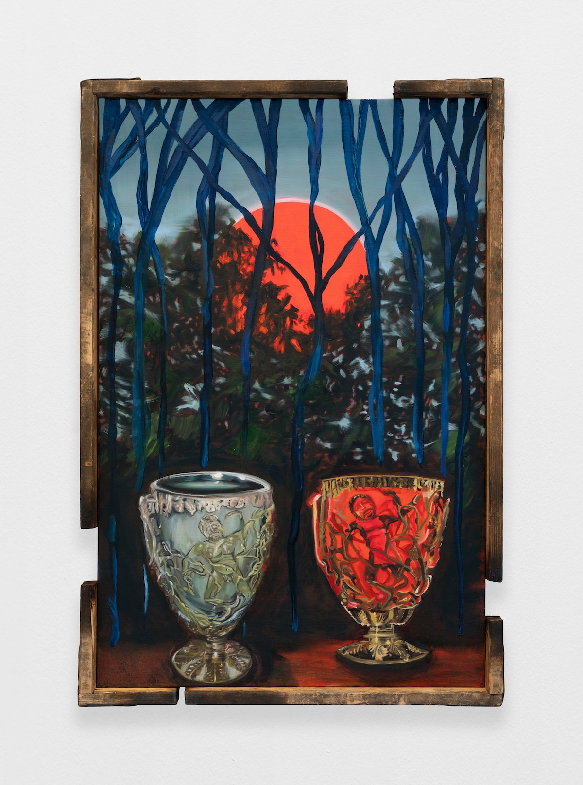 This intention takes belief back to a matriarchal ethos, one where the binary between culture and nature is not so disparate. Re-claiming animism, the approach to these works is alchemic in imagery, form and making: fusing distemper, spirits, mediums, energy, flame and colour. Alchemists experimented with combining base metals to produce luxury metals like gold and silver. These reflexive assemblages reverse this hierarchy within the expanded field of painting by merging seemingly disparate cultural memories and personal affinities, breaking down facades of classification based on class, value and labour. Kneading these bricolages into singular picture planes takes rise to our current era of peak globalization; where a partial processing occurs in relation to the overwhelming access to archives and information held in our hands, yet far from our grasp.