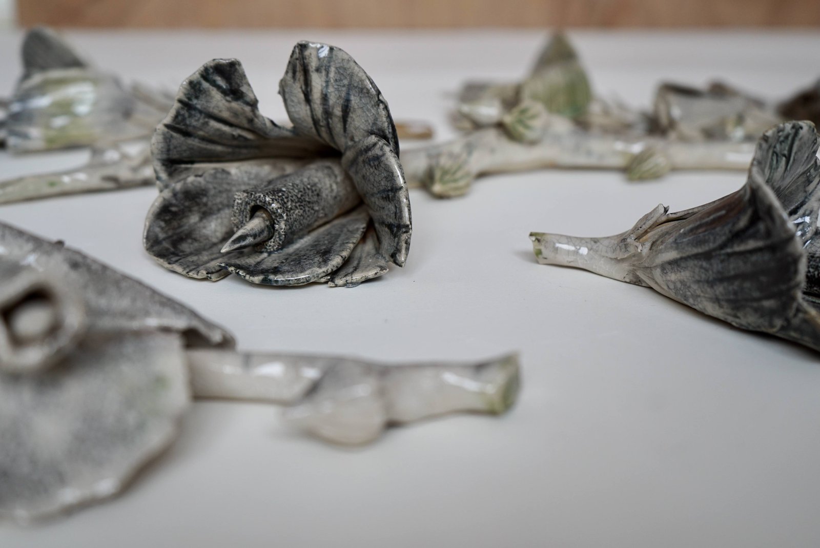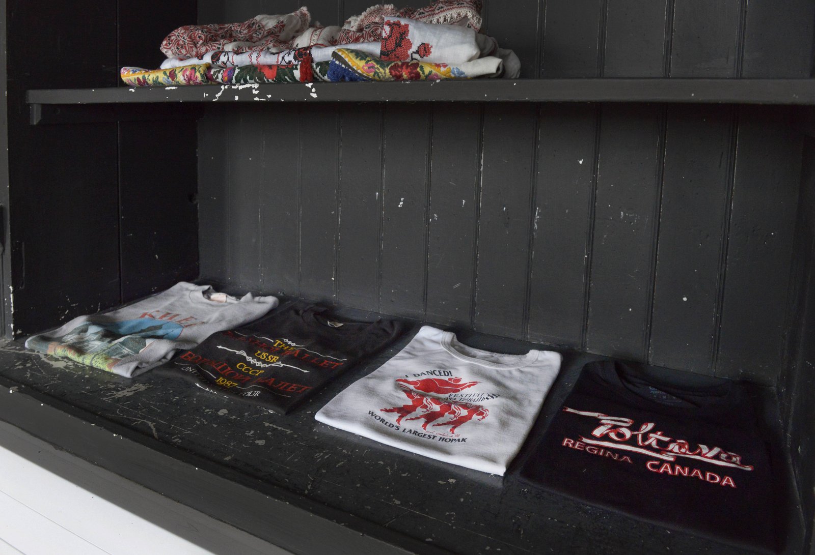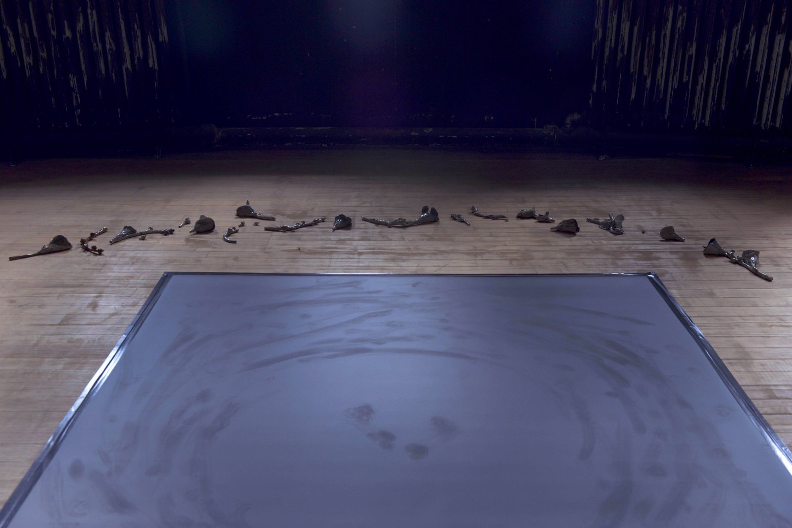 Waiting in a darkened, curved room behind ceiling-high velvet curtains are oil paintings on raw linen embodying symbols' past. Liberated from the archive, they relevé in a balancing act atop USSR-era matryoshka. Slipper dust encircles a vinyl dance mat, stoneware hollyhocks that crackle in applause to a ticking metronome, x-stitches thread cross-century regalia, a woven polypropylene royal mail sac overflows with onions and a para-fictional text titled A Call for Recur printed by Sunday's Print is offered beneath a Cyrillic calendar marking 04.24.22 beneath a diffused wax wreath. This bricolage articulates tensions rising since 2014, idle time spent, anxieties that lie in complicity, and the warping of perspectives moments before the curtains rise…